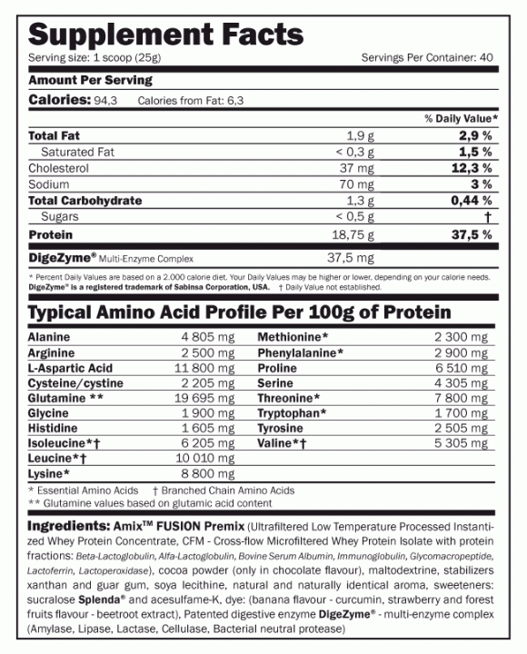 Whey Pro Fusion de Amix es una proteína obtenida de aislado y concentrado de suero de una gran calidad con un alto contenido en aminoácidos ramificados y esenciales. Se trata de un proteína pura con una cantidad reducida de grasa y un bajo aporte de calorías.